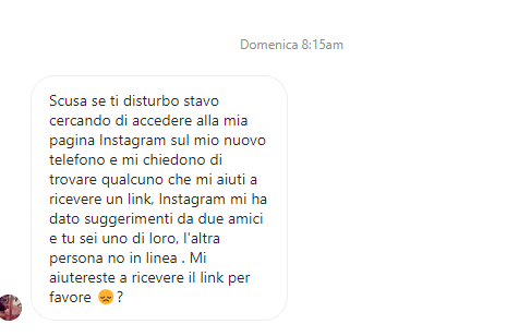 “Scusa se ti disturbo stavo cercando di accedere alla mia pagina Instagram sul mio nuovo telefono e mi chiedono di trovare qualcuno che mi aiuti a ricevere un link, Instagram mi ha dato suggerimenti da due amici e tu sei uno di loro, l’altra persona no in linea. Mi aiutereste a ricevere il link per favore?”